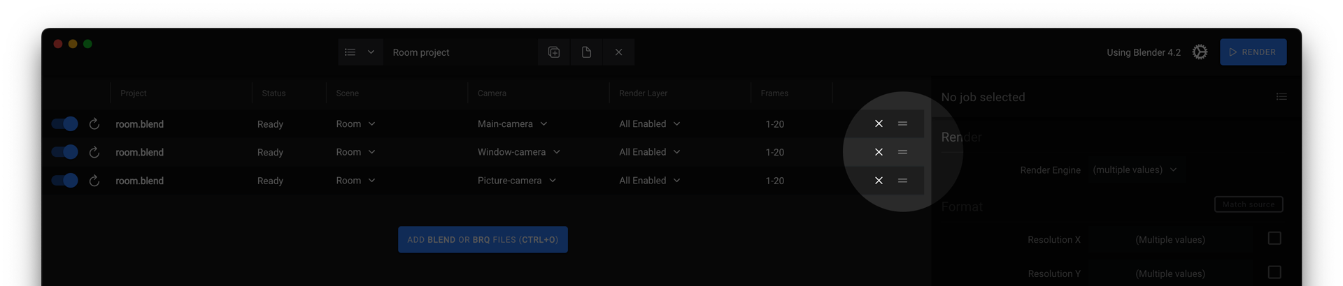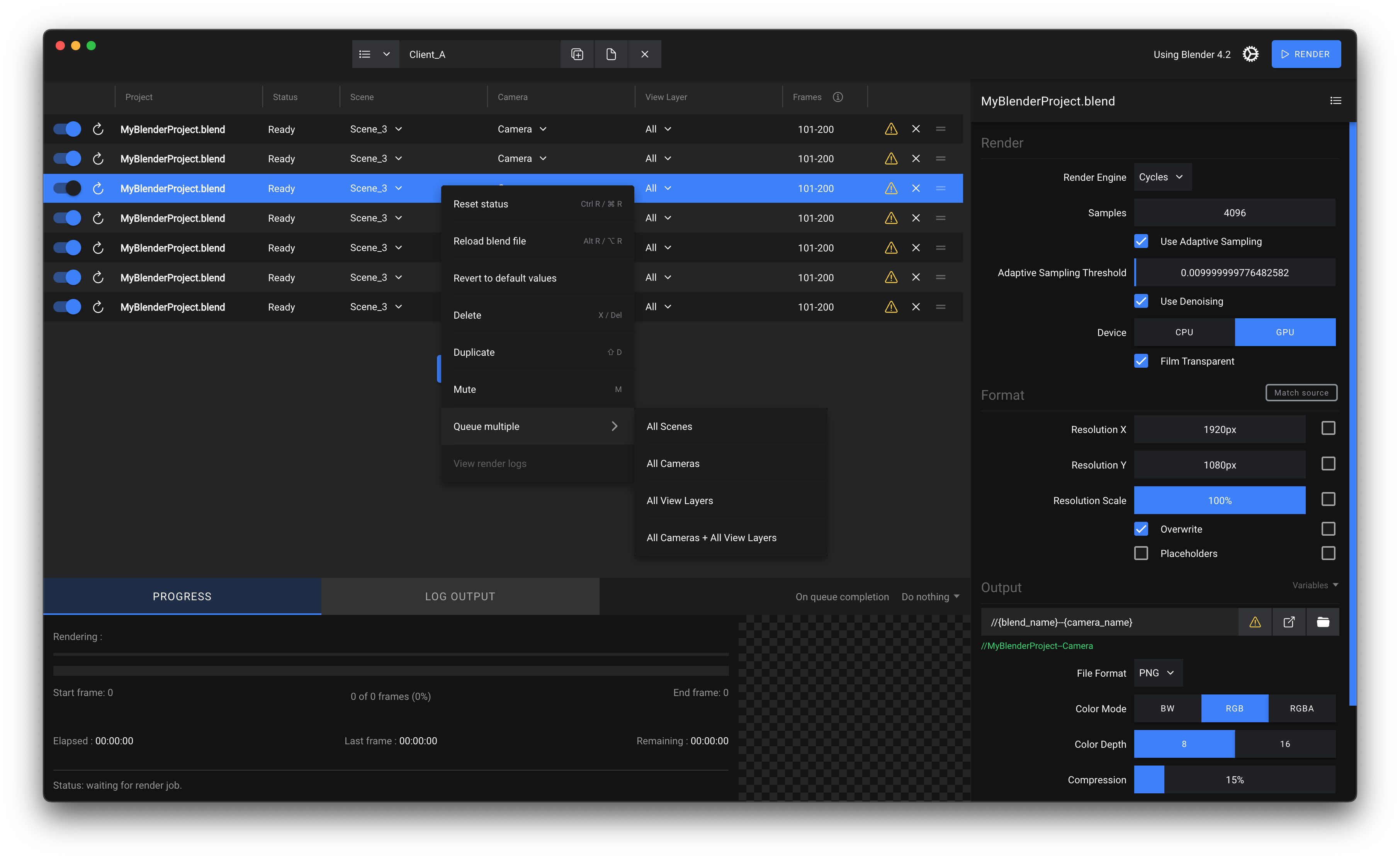 Selecting an item in the queue displays all its render options in a static panel on the right side of the interface.
